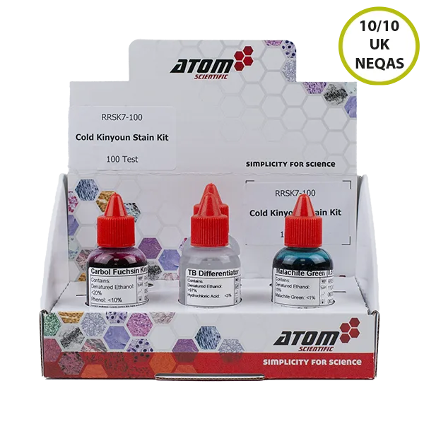 What is the Cold Kinyoun Stain Kit (Malachite Green Counterstain): This stain kit is used for the staining of Mycobacterium Tuberculosis and other acid fast organisms in tissue sections and smears. The walls of Mycobacteria are not readily penetrated so phenol is mixed with the basic fuchsin to overcome this. No heat is required for this method.