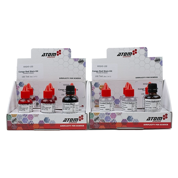 This stain kit is used for the detection of Amyloid Protein in tissue sections. This method removes the need for a differentiation step with the use of a highly concentrated sodium chloride solution which reduces background staining whilst enhancing hydrogen bonding of Congo Red to Amyloid resulting in a progressive staining and highly selective technique.